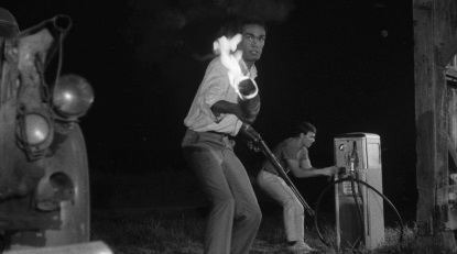 The ghouls, timid, they cower, moan and flee. BOOM! More light! BOOM! More flame. Quick, Ben and Tom battle their way out. Ben waves the rifle, Tom clambers into the rusty truck. But no! Terrified and desperate, Judy can’t bear it and squeezes past to burst outside to be with Tom. Goddamit! Determined, Harry locks her out. She’s trapped. No-man’s land. Ben lays torches on the lawn, jabbing and pushing a burning table leg at the coming crowd. Into the back of the truck. Ghouls claw forward but with a woosh of flame, Ben lights them up! Wow! Dazzling glare of crackling flame as they scatter and flail, still grabbing at the old truck.