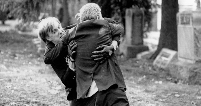 Thunder claps. As they wander and Johnny goofs around, they spot a looming darkly suited figure walking slow and stiff a few plots away. Seemingly lost? Drunk? Homeless? The two reminisce and recall silly teasing and hi-jinks as kids when J would tease B. Like the tiresome office wag, Johnny puts on his spooky “Peter Lorre” voice and starts giving it lots of “they’re coming to get you Barbra!” like a knob. Brothers, eh? “Here he comes now!” he continues as the solo stranger lumbers dully toward them. We see him up close. Older. Forties? Shabby and torn clothes. Pale skin, heavy creased face.