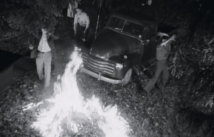 They fall into a plodding process, sharing stories of their circumstance as hammers pound and wood stacks up. Thinking barb is the owner of the house, Ben’s enquiring about resources. Beekman’s Diner down the road? That’s where he found the truck. Listened to radio. The things attacked a gasoline truck. Saw the truck moving in a funny way. They were catching up to it. “Slammed on my brakes.” He wrenches and saws table legs as he talks, tossing them to the fire. “Went right through the bill board, ripped through the gas pump and never stopped moving. By now it’s like a moving bonfire.”