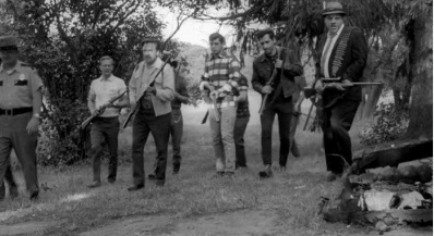The TV is back on. More news of the mysterious radiation steadily increasing. “Dead bodies will continue to be transformed into the flesh-eating ghouls.” But hell, USA! USA! USA! News reports now show Butler County, Pennsylvania have a posse rounded up. Hicks and trucks and rifles and baccy chewin’ redneck lynchin’ types. Straw hats, marches, turnups and work-boots. Reporters talk to the chief baccy-chewin’ confederate hard-ass in charge, McLellan. “Yep. Ghouls can be killed by a shot to the dead or a heavy blow to the skull…”