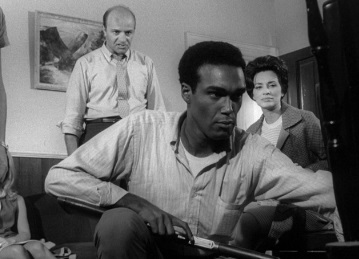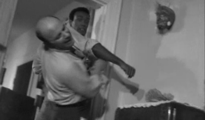 In the house the arguments escalate. Cellar! Board the windows! No, cellar! No! Board the windows! It rises to panic. Harry wants to take Barb down with them. And bring the food too. “We got a right!” Ben is standing firm. “It’s tough for the kid that her old man is so stupid.” Bold and fierce they roar at each other as the ghouls bang and thunder at the buckling, splintering doors. But Ben, if you’ll pardon the vernacular, ain’t going to die for an idiot whitey. “You can be boss down there! I’ll be boss up here!” Finally Harry retreats down the stairs, boarding himself, his wife and his child behind the wooden door. Tom’s girlfriend Judy comes upstairs to join Barb and Ben. The house is split. It’s time to take sides.