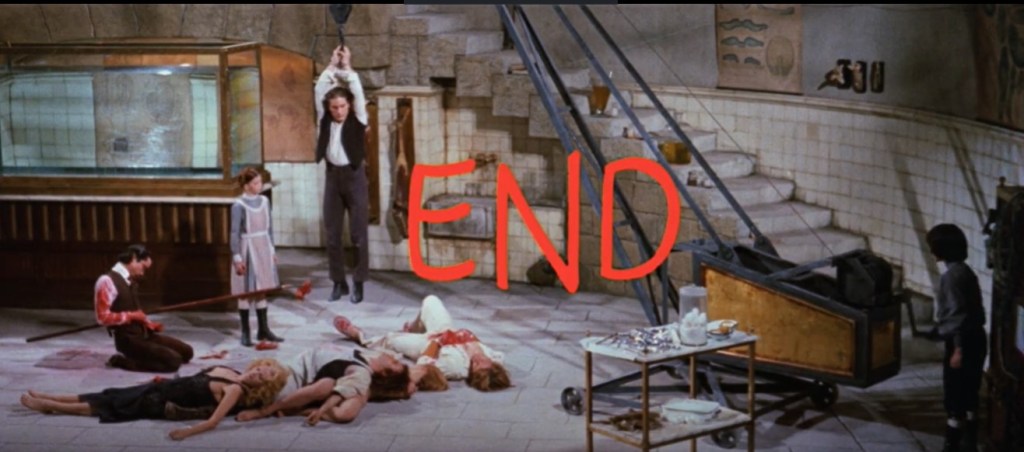 Bleeding out, the Baron stumbles with his bloodied stump, back to the lab, holding his dismembered hand, thrusting it against his bloodied wrist pathetically. “It’s all your fault!” He yells at Nicholas. Running to the suspended Nicholas he brandishes a scalpel to kill him, only to find behind him, approaching silently with a long window pole/hook is Sacha. And with a 3D inspired thrust, he pierces The Baron, who has his innards thrust out and waggled at the camera on the end of the pole.