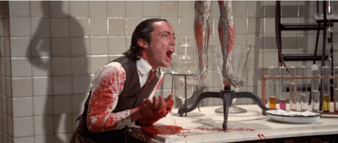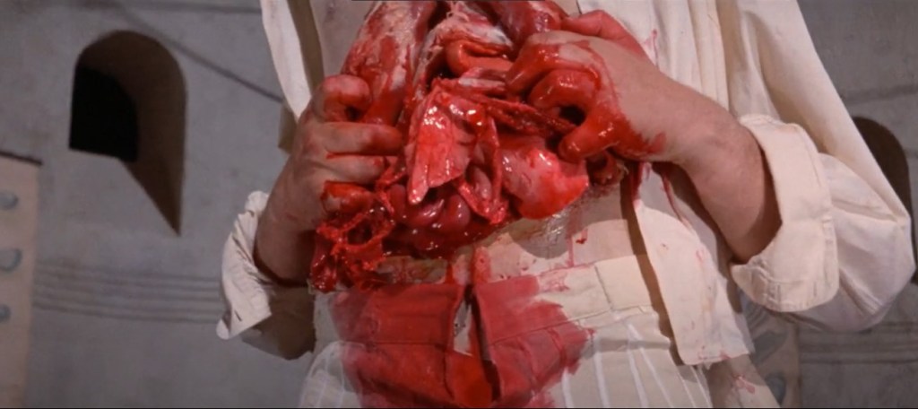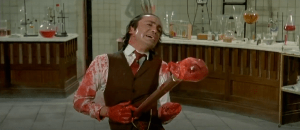He opens her up, solemn, sincere, firm of jaw and task. Her eyes open softly, but she makes no movement. The crazed Baron smears her breasts with blood like he’s seasoning a chicken. In goes the hand with extra squelch, counting her innards. “Spleen, kidneys, gall bladder…” Breathless and horny as he delves around insider her, panting and sweating – “Liver!” it’s not really clear what he’s up to but boy oh boy his mounting excitement is apparent as he thrusts and gasps and thundering piano chords tell is he’s shot his load in his smock. Nice.