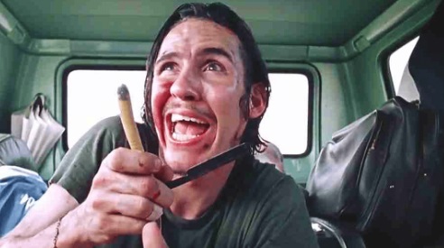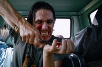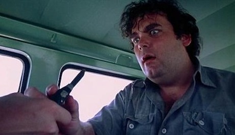 How you feeling? Okay? Got the set up? We’ll talk more about this in the next “is it any good?” section of this piece. (Article? Essay? Review? Exhausting spoiler-filled plod?) But we are now very much in fear territory. Despite the minimal bloodshed of the palm-carving in the van, the movie has done its best to have us holding cushions over our faces, white knuckle grips, tumbling stomachs and whimpering “no…no…no…” A masterpiece of tension, we have seen nothing really. Nothing but an oddball hitchhiker, a dead armadillo and some dumb kids. Oh but we know. We KNOW. And we can only hold our breath and pray, PRAY it isn’t going to be…what we just know it’s going to be.