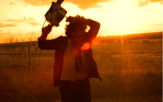 Finally, in the searing sunrise of pinks and oranges, Leatherface – furious with frustration – whirls and winds alone on the road, shrieking, roaring chainsaw groaning and screaming in his hands, petrol fumes pumping and coughing, around and around and around in rage. Lens flare catches him in all his monstrous glory, bellowing at the one who got away.