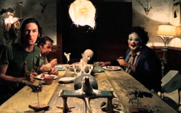 For on the beaten wooden workshop table we see the shape of Kirk’s limp body. With a growling scream and oily belch of smoke, Leatherface tugs the huge chainsaw roaring into life like a bellowing, angry dinosaur. Lifted high, he brandishes it and begins to carve, jab, slice and devour the off screen body like an ice sculptor or butcher. The deafening screams continue…