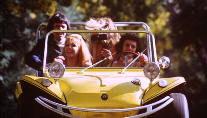 But the journey is taking longer than it should and the highway is narrowing to a dirt track and Sue is getting the heebeejeebies. “Just a little futher” Frank says. But Sue is having none of it. As they slow to stop at a level crossing, suddenly Jon appears leering and gurning from the back seat. Sue escapes the car and runs, but Jon is flapping after her, all flared dungarees and floppy shoes. At knife point, as the thunderous train clatters past in the dust, Sue is walked back to the car and forced back into the seat. And on they drive.